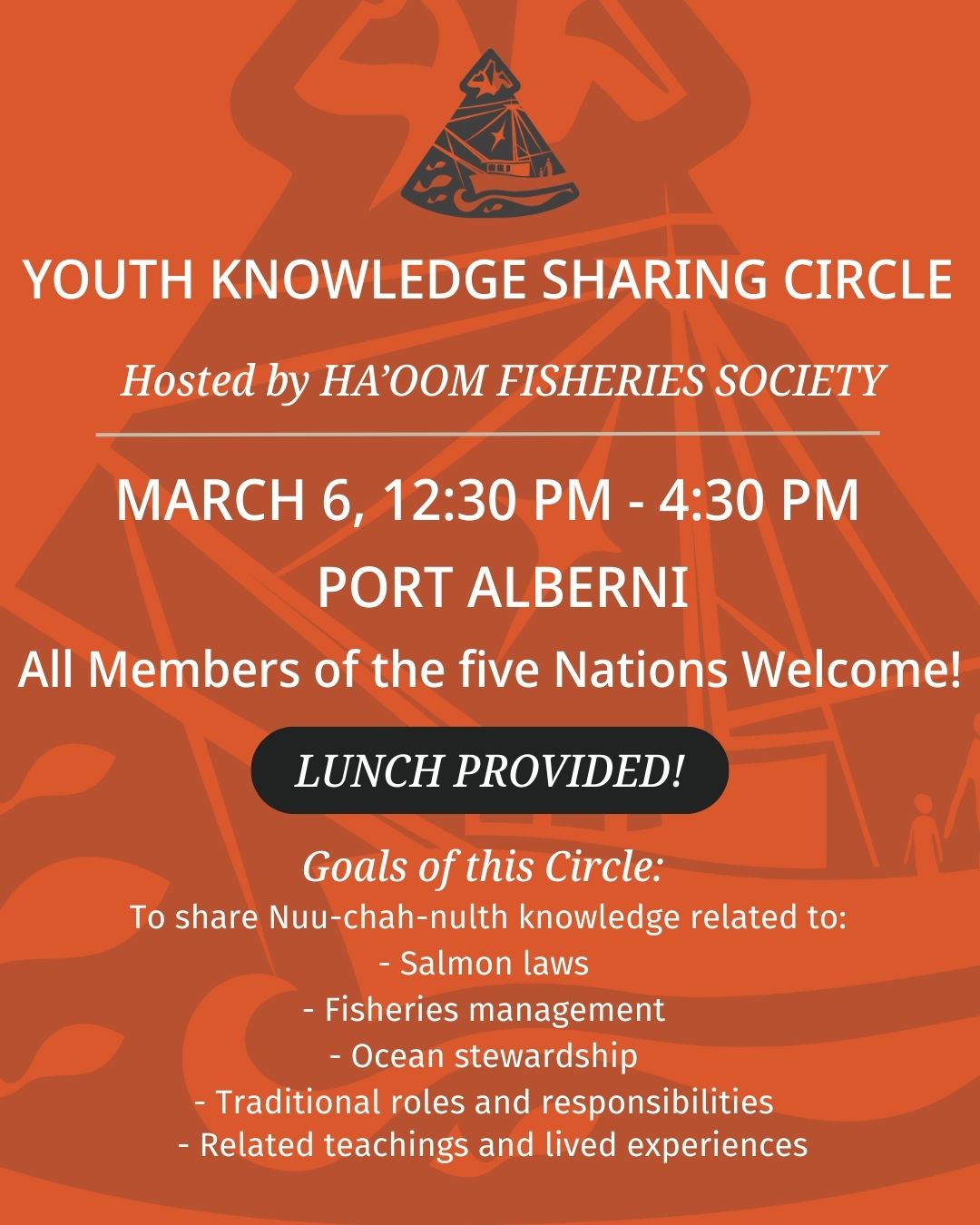Youth from each of the five Nations are invited to gather, share a meal, and take part in a meaningful exchange of knowledge. This circle offers a unique opportunity to learn from experienced fishers and fisheries managers, explore traditional and cultural fishing practices, and gain insight into commercial and sustainable fisheries.
